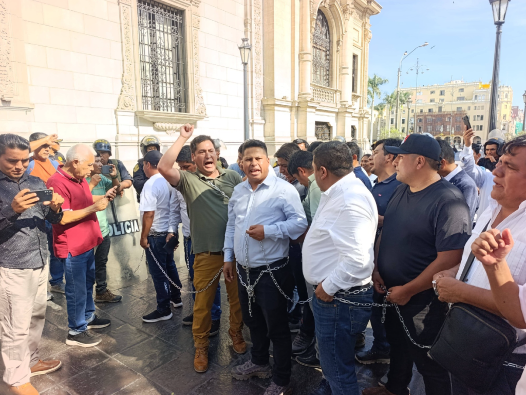 Lima, 23 de abril de 2026 – En una medida de fuerza sin precedentes, alcaldes de la Mancomunidad Municipal AMUVRAEM (Asociación de Municipalidades del Valle de los Ríos Apurímac, Ene y Mantaro) se encadenaron esta tarde en el frontis del Palacio de Gobierno para denunciar el abandono sistemático y la falta de inversión del Estado en el VRAEM.